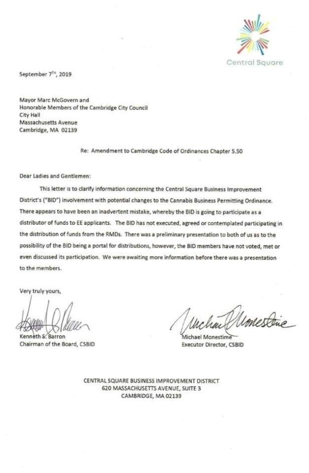 That proposed "fund”, however, was rejected by the city council for a myriad of reasons; not least so because, in a September 5th, 2019 letter to the City Council, there was a misleading statement made to the City indicating the "dispensaries had entered into a legally binding contract with the Central Square Business Improvement District" to oversee their proposed fund. That misleading statement, in turn, had to be corrected in a formal letter from the Central Square BID to the City Council on September 8th, 2019 that made it clear no such agreement existed (and that discussions related to overseeing the fund in question had not moved beyond a preliminary stage).