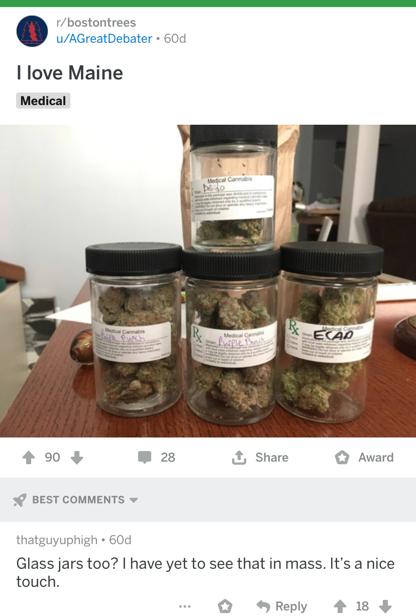 Boston Trees with 19,000+ members is the most popular Massachusetts based cannabis sub on reddit. A quick search of the sub reveals hundreds of posts about Mass medical cannabis patients traveling to the state of Maine for the craft medical cannabis at around half the price.