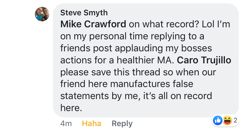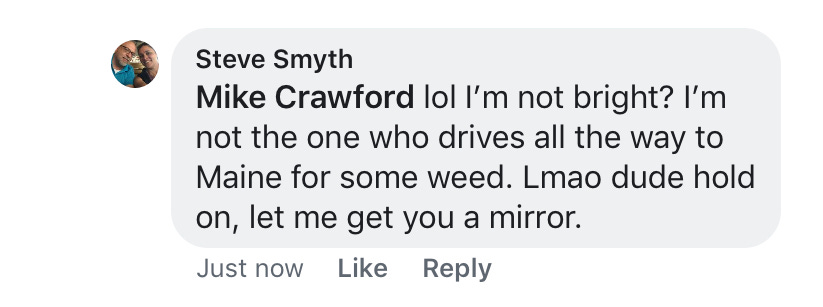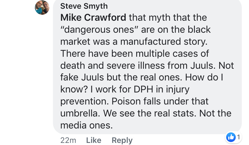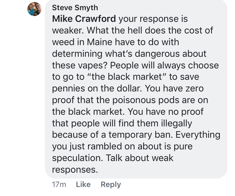 Smyth had a lot to say today on the facebook page of a mutual friend. It was your typical facebook dust-up. The op (original poster) was thrilled that Mass Governor Charlie Baker had just banned sales of all vape product for the next four months citing public safety. I posted sentiments similar to what Mass Cannabis Control Commissioner Shaleen Title has been quoted, that the ban was likely to cause additional and far greater harm by pushing more patients and consumers to the illicit market where counterfeit vapes and bootlegs are a known danger.